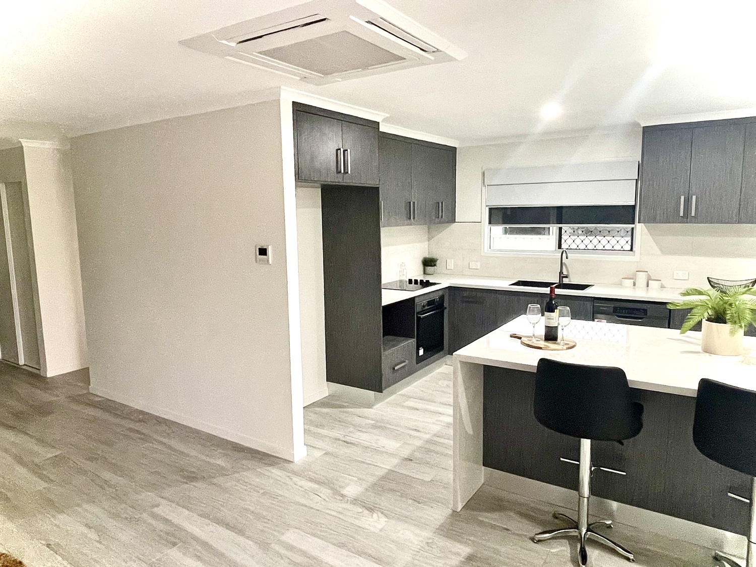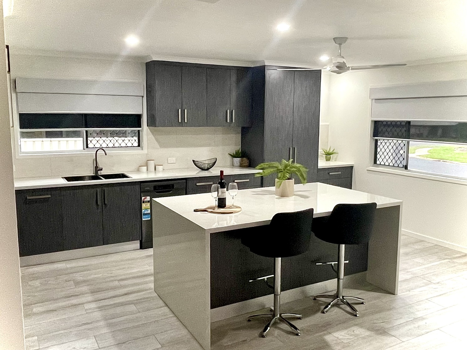 – Stunning designer inspired kitchen with stone benchtops, waterfall ends, high-end cabinetry and quality appliances